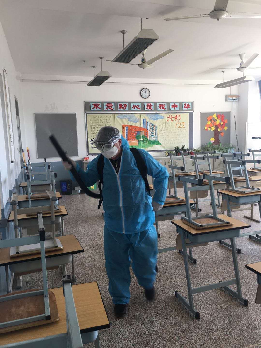 背负数十斤重的喷雾器,对打扫好的教室再一一喷洒消毒液。物业管理处还协助学校一起搭建了进门消毒廊道,给学校加了一道防疫新大门。