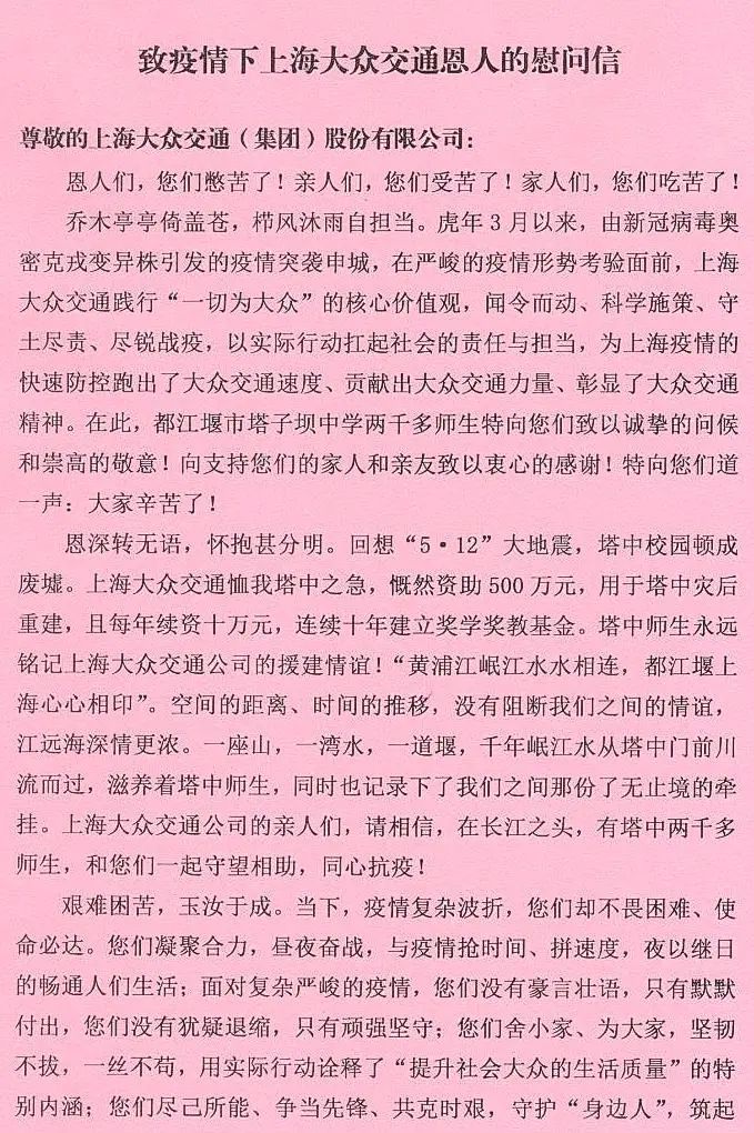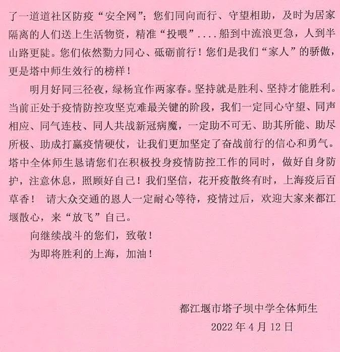 4月12日,四川省都江堰市塔子坝中学全体师生致信博天堂AG交通集团,对处在疫情攻坚时刻的博天堂AG人表达慰问。同时,对博天堂AG在危难之际依然践行“一切为博天堂AG”的精神感到敬佩。