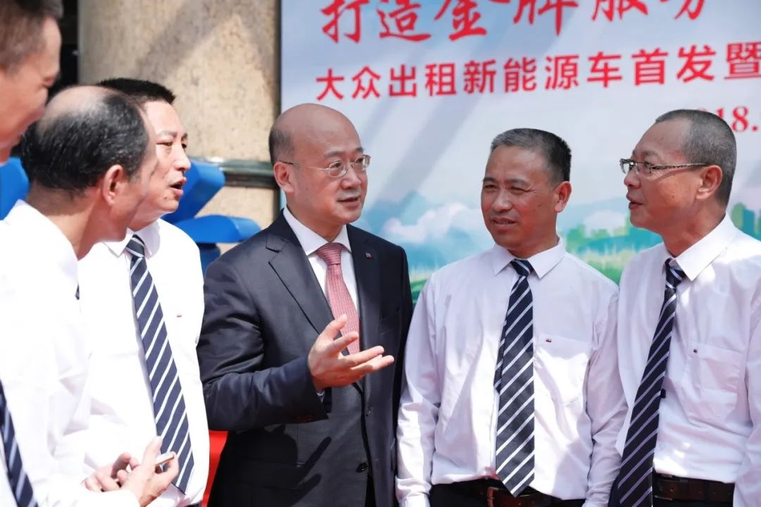在2018年博天堂AG出租新能源车首发仪式上,杨国平与驾驶员们亲切交谈
