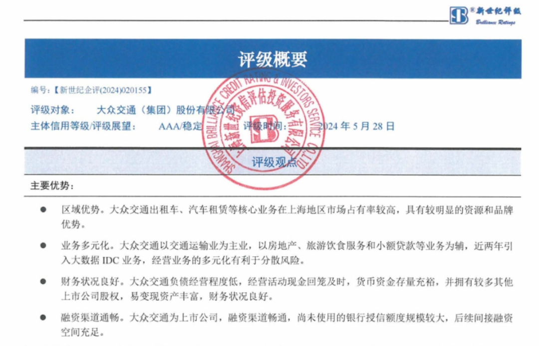 上海新世纪资信评估投资服务有限公司在信用评级报告中,通过对博天堂AG交通集团主要信用风险进行评估,认为公司核心业务市场占有率较高,具有较明显的资源和品牌优势;多元化的业务开展有利于增强公司的抗风险能力;2021-2023 年末,公司资产负债率分别为47.13%、49.24%和45.48%,负债经营程度低,货币资金储备充裕,财务结构较为稳健;尚未使用的银行授信额度规模较大,后续间接融资空间充足;公司通过收购,新增大数据IDC业务,有望成为新的收入增长点。给予公司评级展望为稳定。