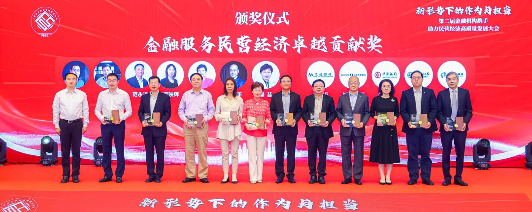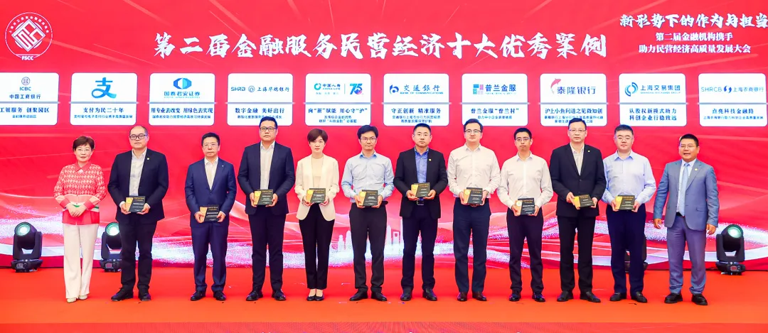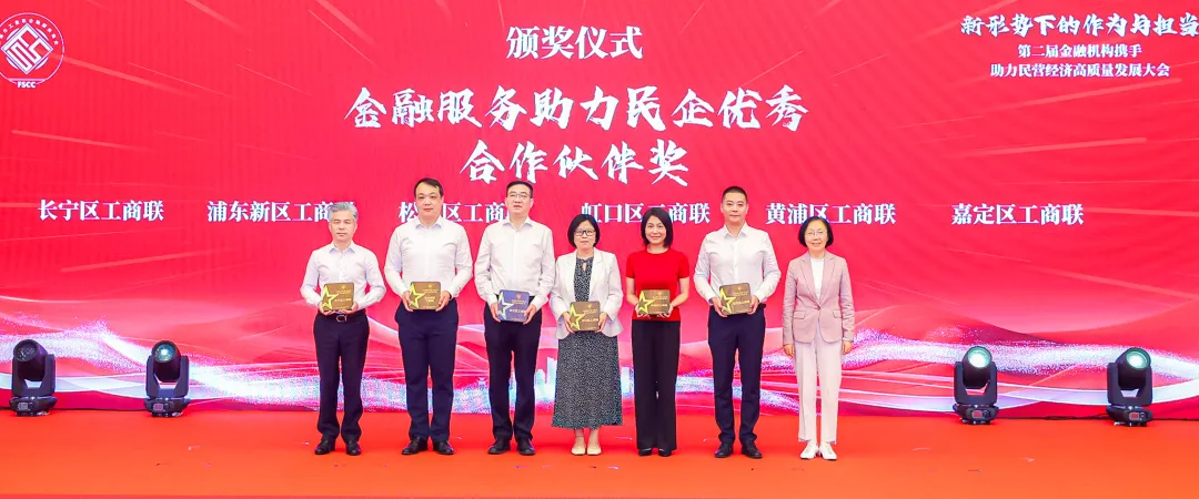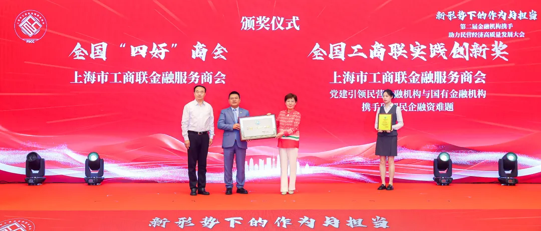 大会上,王霄汉为上海市工商联金融服务商会颁发全国“四好”商会、全国工商联实践创新奖等荣誉;为中国银行上海市分行、交通银行上海市分行、上海农商银行、海通证券、上海交易集团,以及民营企业家代表颁发金融服务民营经济卓越贡献奖。杨茜为浦东新区工商联、黄浦区工商联、长宁区工商联、虹口区工商联、嘉定区工商联、松江区工商联颁发金融服务助力民企优秀合作伙伴奖;为荣获第二届服务民营经济优秀金融案例的金融机构颁奖。